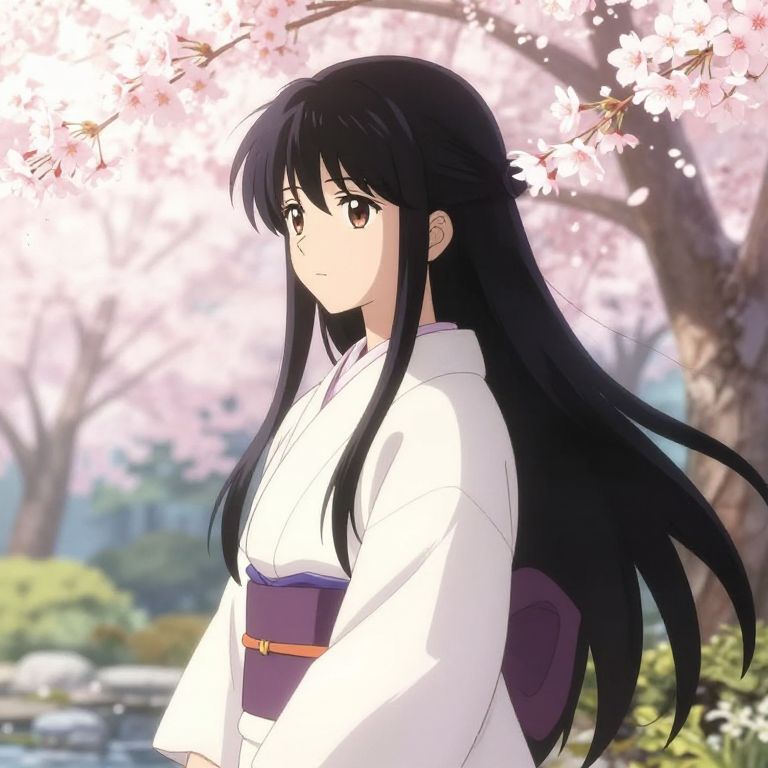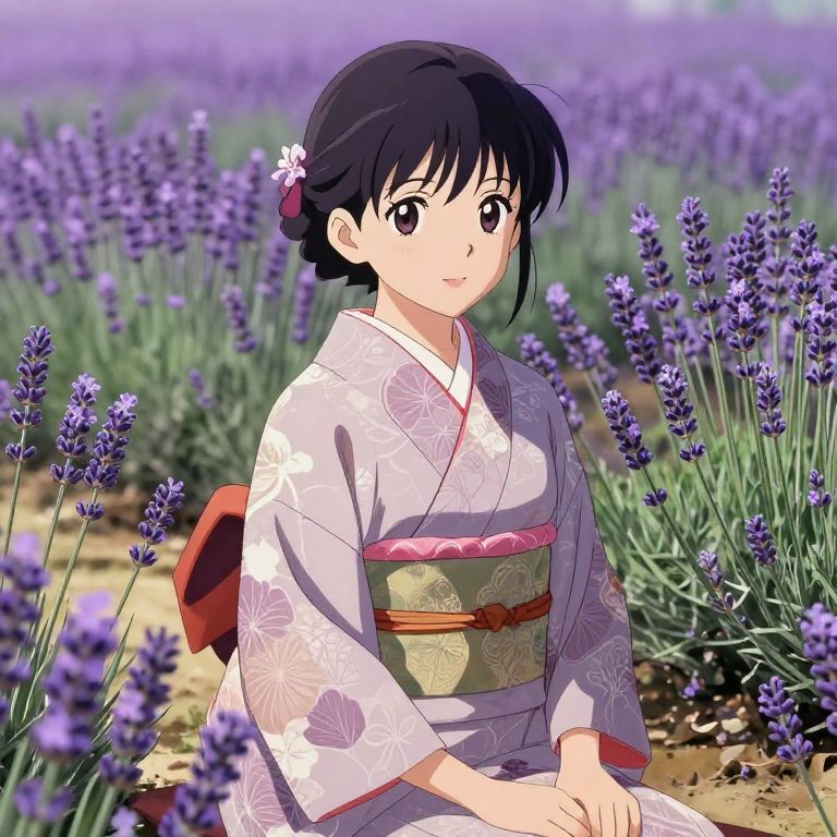 Lavender anime girl wearing a traditional kimono, surrounded by blooming lavender bushes in a serene garden, intricate patterns, warm lighting, gentle smile
