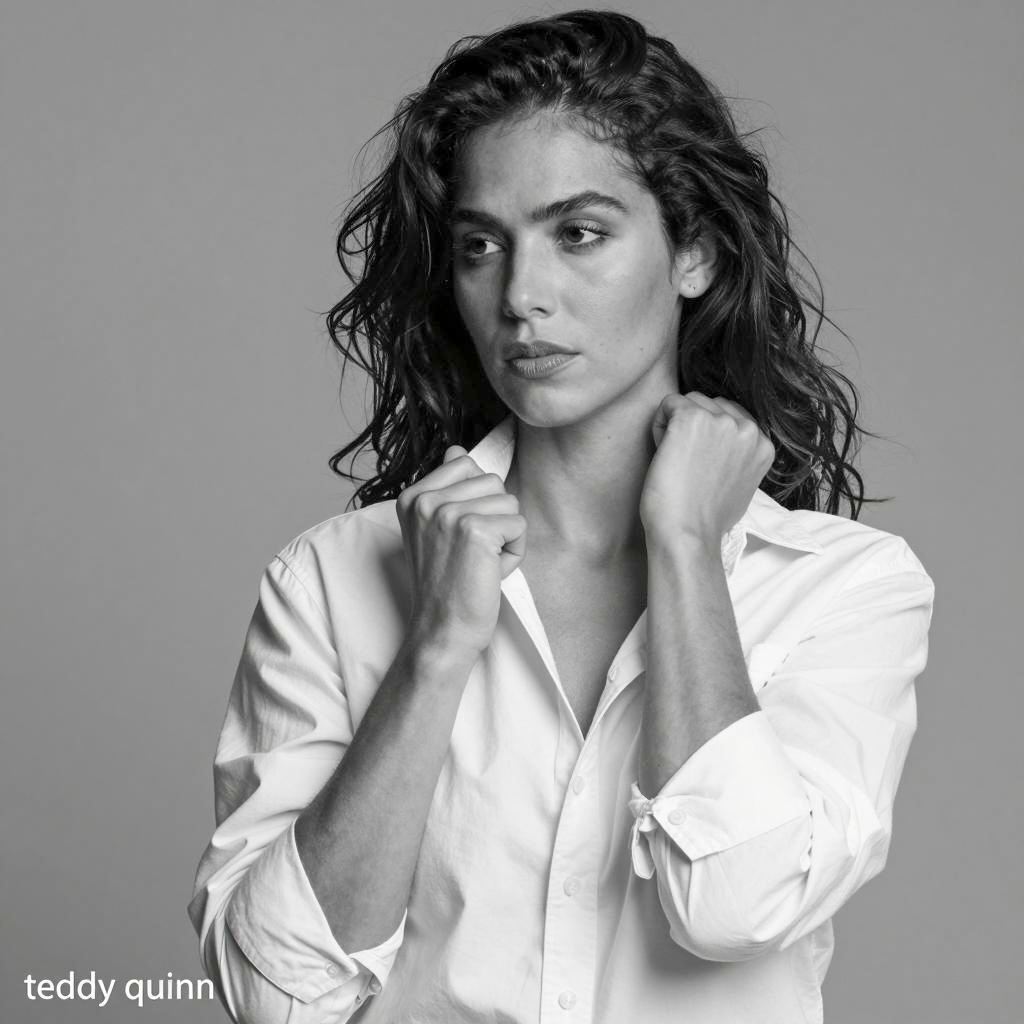 Black and white photograph of a woman with light brown skin and dark, wavy hair. She is wearing a loose, white button-up shirt with the top buttons undone. Her right hand holds the collar of her shirt, and her left hand rests near her neck. She has a serious expression and is looking slightly to the left. The background is plain gray. The artist's "teddy quinn" is in the bottom left corner.