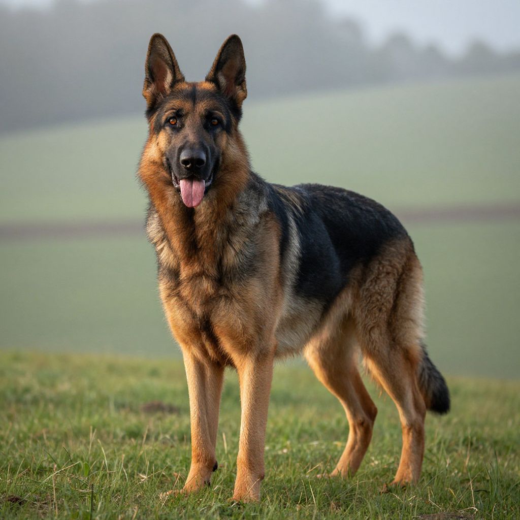 British German Shepherd standing proudly on a misty green hill, early morning light casting soft shadows, detailed fur texture, alert expression, natural environment, photorealistic style with vibrant colors and sharp focus.