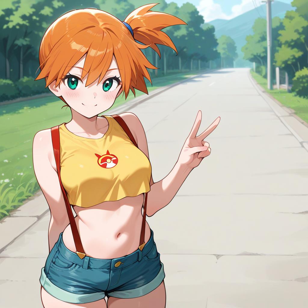 Masterpiece, best quality, highres, 1girl, misty (pokemon), orange hair, solo, shorts, suspenders, side ponytail, midriff, yellow crop top, navel, short hair, denim, denim shorts, smile, cowboy shot, standing, peace_sign, outdoors