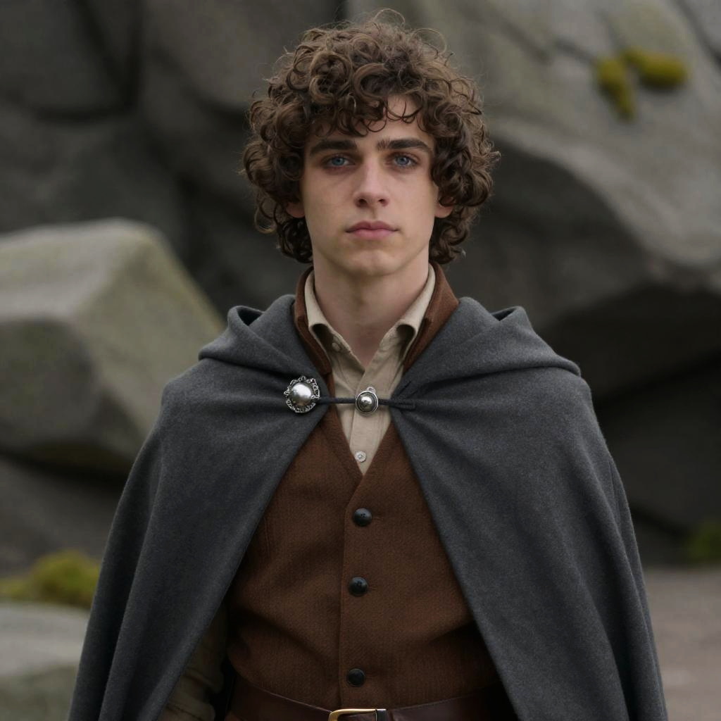 Photograph of a young man with curly brown hair and blue eyes, wearing a brown vest and grey cloak with a silver brooch. Background includes rocky terrain with blurred stones and moss. His expression is neutral. He is centered in the frame.