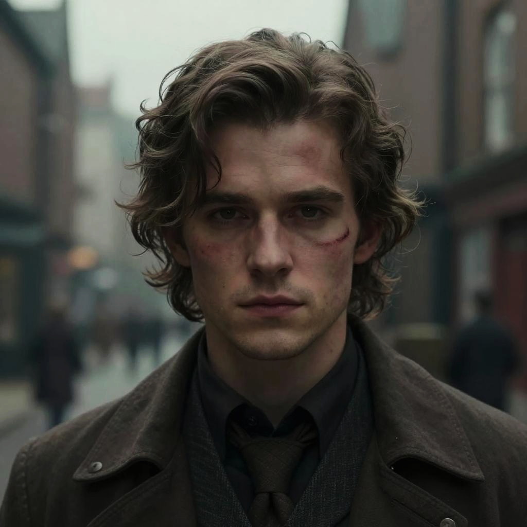 28 year old assassin, medium-length wavy ash-brown hair, swept back, Appearance rugged handsomeness, tan skin, brown eyes, subtle scar on left cheek, light stubble, soft expression, detailed, atmospheric color washes, high quality, victorian street scenery at dusk