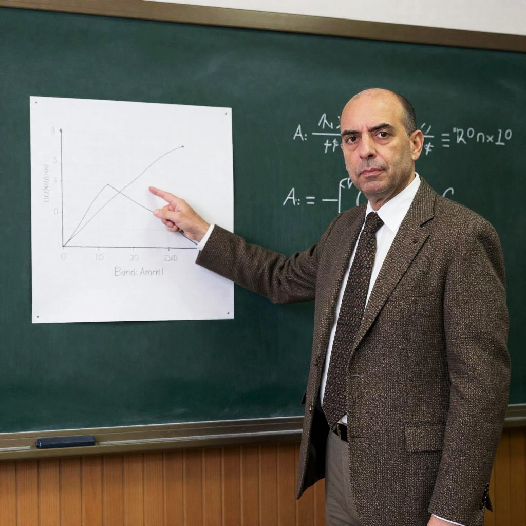 Middle-aged man with balding head, wearing brown checkered blazer, white shirt, and patterned tie, points to white chalkboard with graphs and mathematical equations. Classroom setting, dark green chalkboard, wooden paneling, neutral expressions, standing, serious demeanor.
