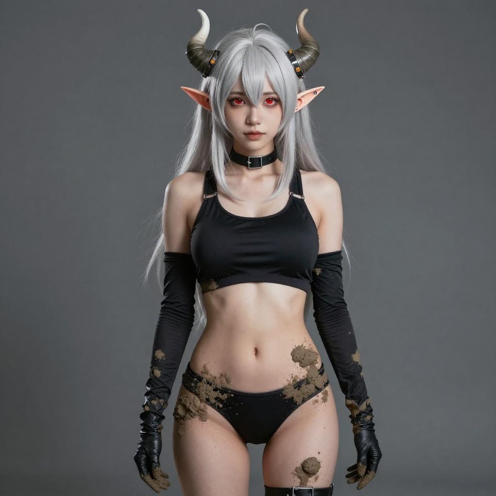 A digital CGI image of a white-skinned, slender, young woman with long silver hair, red eyes, and pointed elf-like ears. She wears black, cropped sports bra, matching black panties, and long black gloves with brown, textured patches. Her head is adorned with two curved, black horns. The background is a plain, dark gray. She stands facing forward with a serious expression. The image has a fantasy, demonic aesthetic with a focus on her otherworldly appearance and contrasting black clothing against her pale skin.