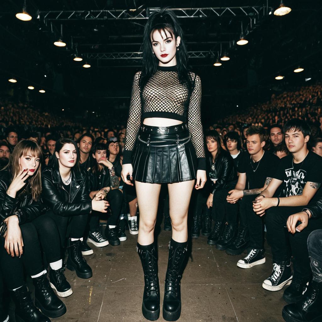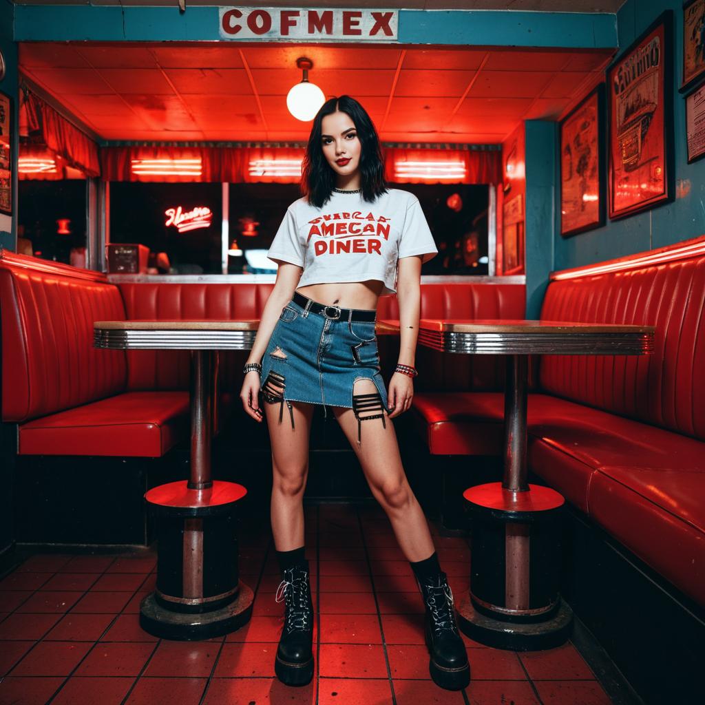 Alt Fashion Micro Skirt, full-body portrait of a young woman posing with confidence. She wears a tattered flannel shirt worn open paired with a high-waisted schoolgirl skirt in navy tartan and black platform combat boots. The scene is a vintage American diner booth bathed in red light. Grunge style, Y2K aesthetic, photorealistic, 8k, dramatic shadows.