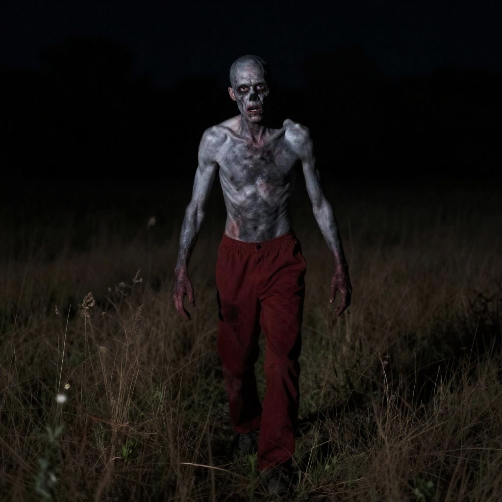 Photograph of a group of seven zombie-like men running across a grassy field. They have bloody, torn clothes and distressed expressions. Center man has a beard, striped shirt, and dark pants. Background shows trees and a fence.