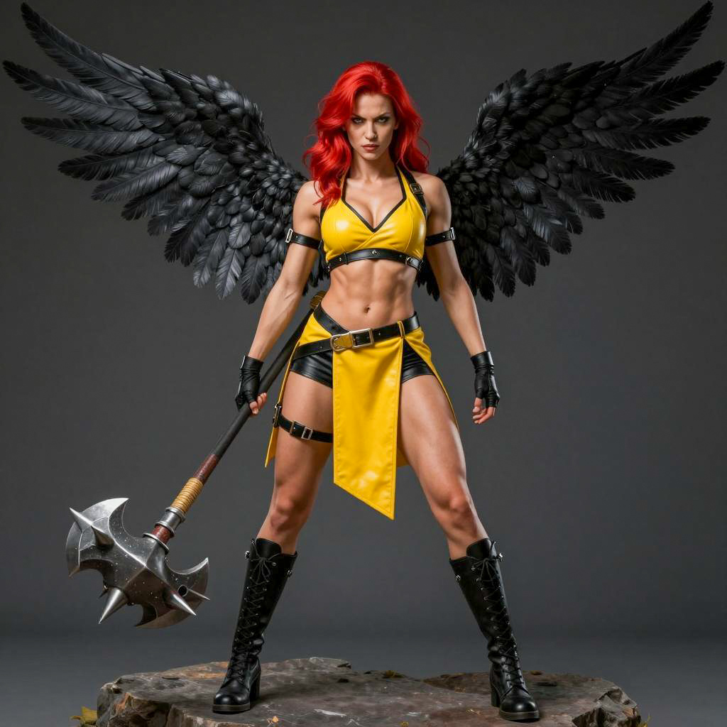 Female warrior with red hair, black feathered wings, muscular build, yellow and black outfit, holding spiked mace, standing on rock, dark background, intense facial expression, realistic digital illustration, black gloves and boots, black arm bands, wings spread wide.