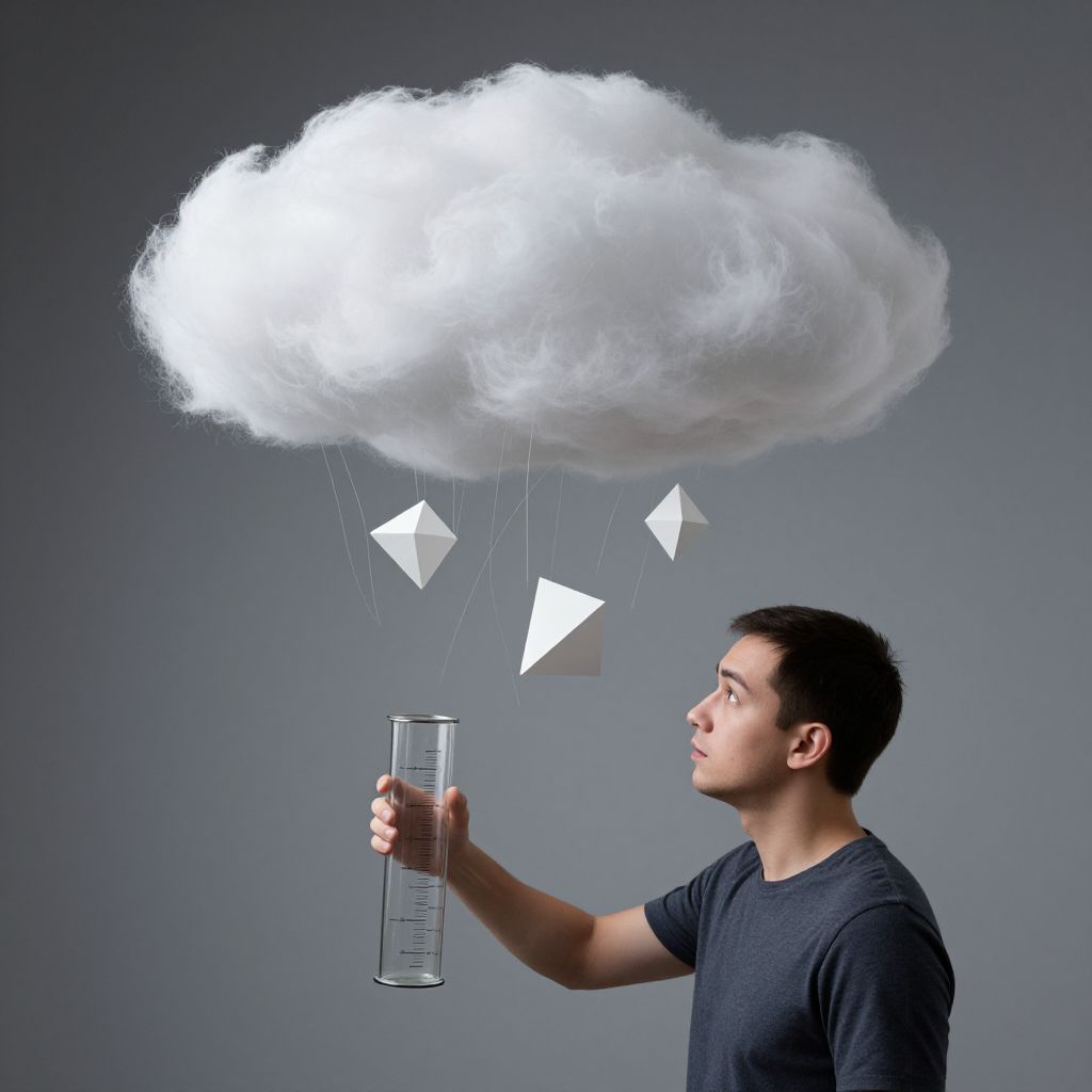 A man with a graduated cylinder for a head teaches clouds how to condense into precise geometric shapes for aerial architecture.