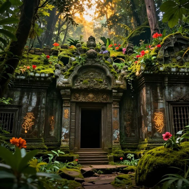 Photograph of an ancient, moss-covered stone temple doorway in a dense, sunlit forest, adorned with vibrant flowers and intricate carvings.