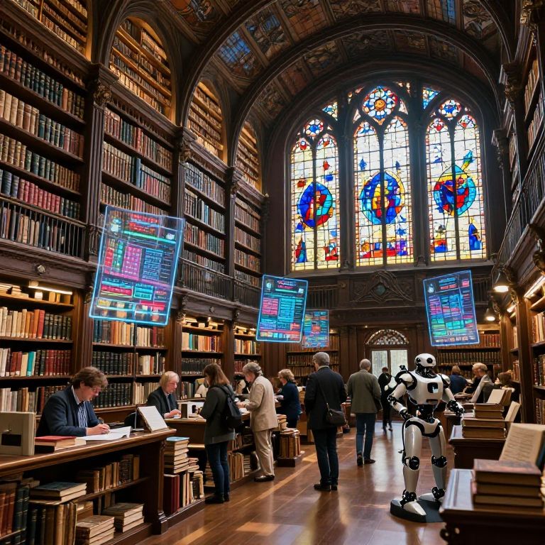 Consut envisioned as a grand library hall of the future, lined with towering bookshelves filled with digital and ancient tomes, warm ambient light filtering through stained glass windows, robotic librarians assisting scholars, hyper-realistic, cinematic atmosphere