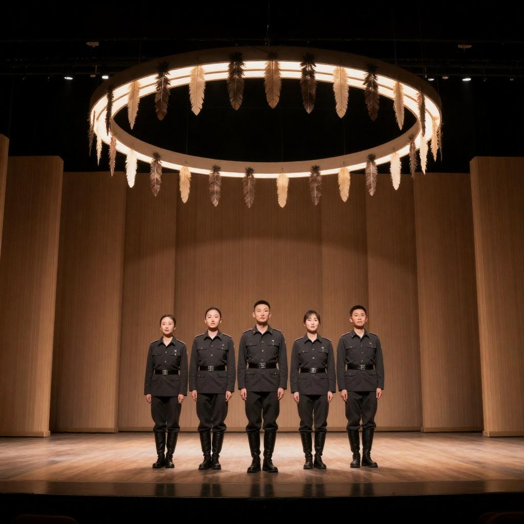 Photograph of five people standing on a wooden stage with a striped, wooden-paneled background. They wear dark, military-style clothing and boots. A large, circular, illuminated structure with feather-like decorations hangs above. The scene is framed by dark, out-of-focus objects in the foreground.