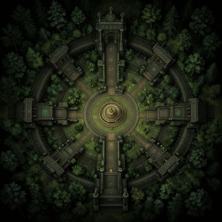 This digital artwork depicts an intricate, symmetrical, ancient temple-like structure viewed from above. The central hub features a glowing, circular golden centerpiece surrounded by concentric rings of dark, ornate pathways and stone buildings. The structure is surrounded by dense, dark green forest, with trees partially obscuring the edges. The temple's design includes four large, stone towers extending from the central hub, each adorned with detailed carvings. The overall color palette is dark and moody, with green foliage contrasting against the black and gray stone. The image has a surreal, almost mystical quality, reminiscent of fantasy or sci-fi art.