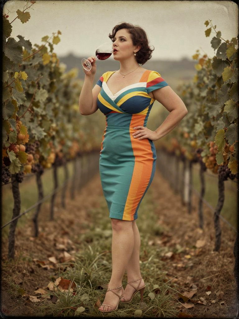 A hourglass woman in a chic, fitted red dress with short sleeves and nude strappy heels, stargazing in a secluded orchard, captured in a vintage photo style. Sexy. Pretty face and beаutiful eyes. Big breasts