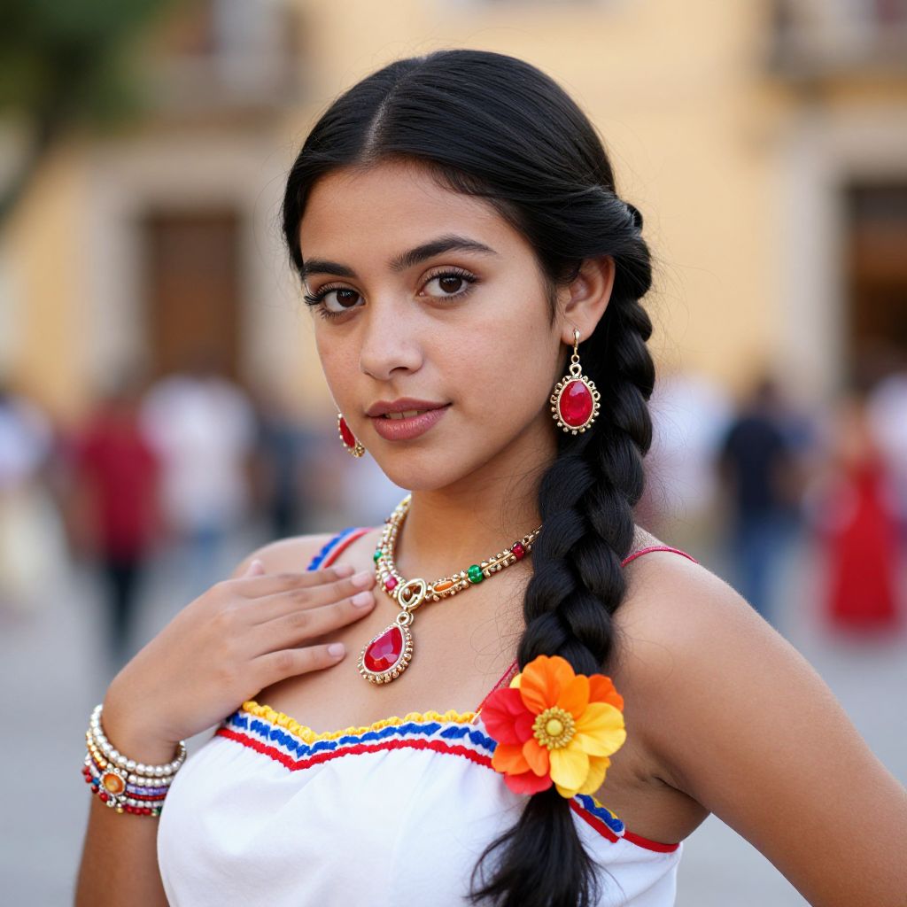 Photograph of a young Latina woman with dark hair in a braid, wearing a white dress with colorful embroidery, red flower, and jewelry, standing