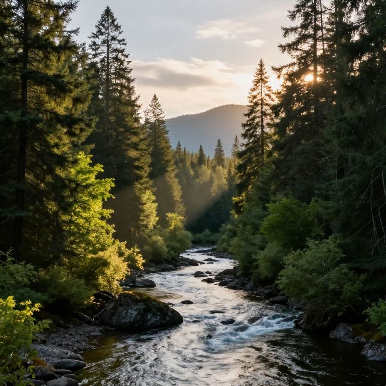 Sunlight filters through towering evergreen trees, casting radiant beams over a tranquil river winding through lush greenery and rocky banks, with distant mountains silhouetted against a serene sky in the Pacific Northwest.