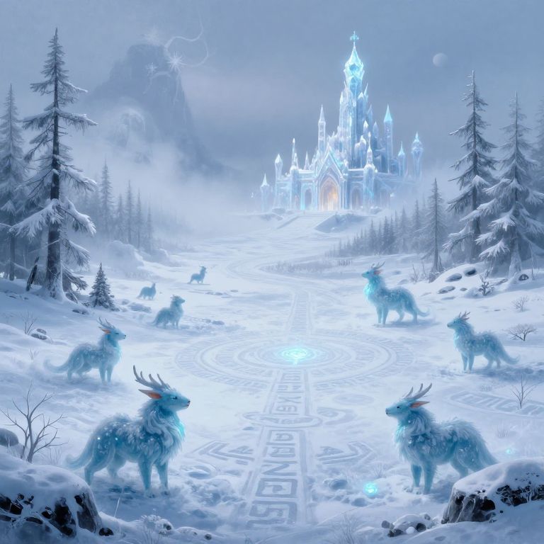 Sneznaya, a fantasy tundra with mythical ice creatures roaming vast snowy plains, ancient runes glowing faintly beneath the snow, frost-covered forests shrouded in mist, a distant palace gleaming with crystals, painterly style.