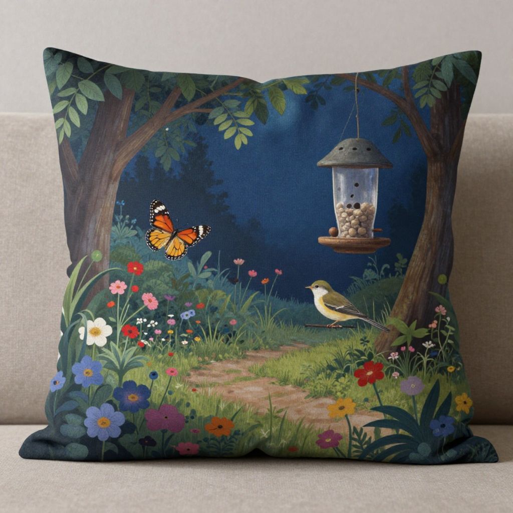 Decorative throw pillow with a detailed, colorful illustration of a nighttime garden. Features a yellow bird, orange butterfly, hanging bird feeder, and vibrant flowers