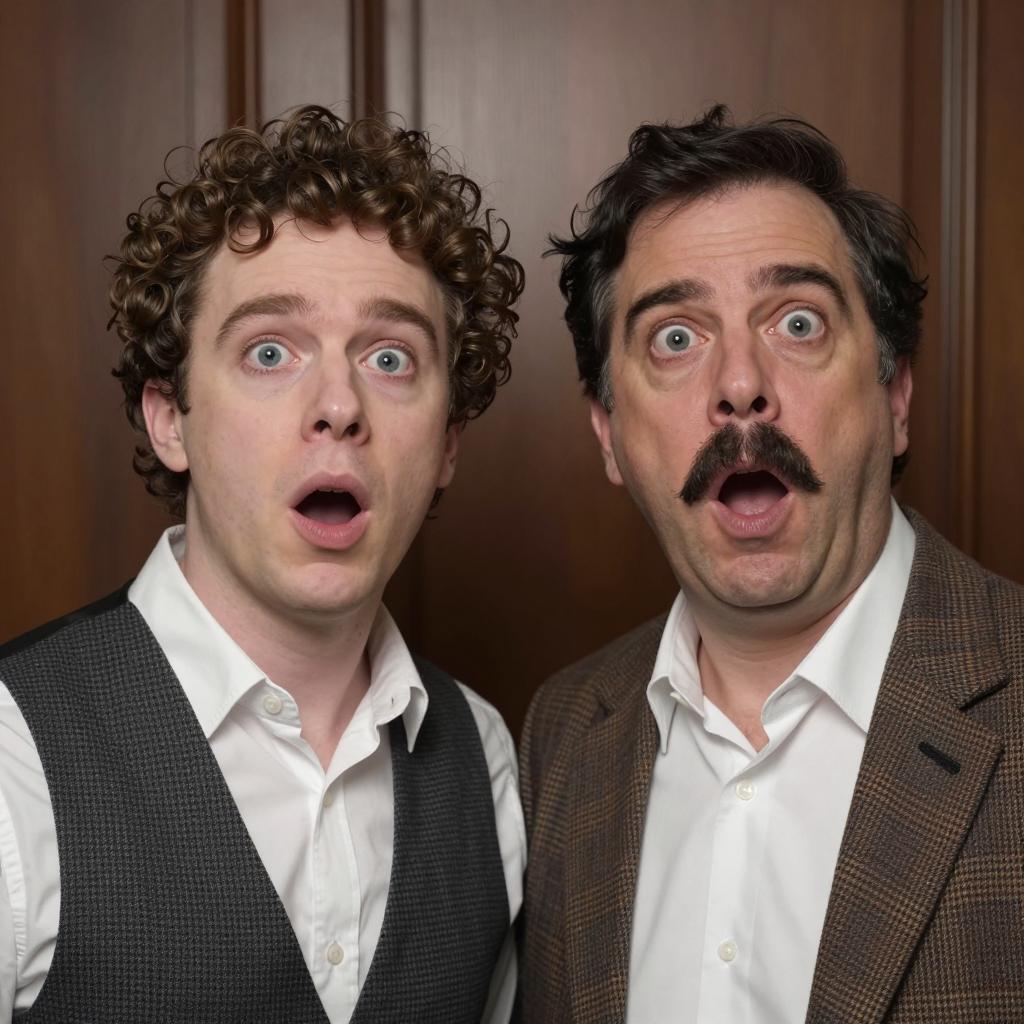 Black-and-white photograph of a man with short, dark hair holding a skeleton against his chest. He has a surprised expression with wide eyes and an open mouth. The skeleton's skull is on his right shoulder, its ribcage visible. Background includes tiled wall and an IV pole on the right. Man's right hand points to the left, and his left hand grips the skeleton.