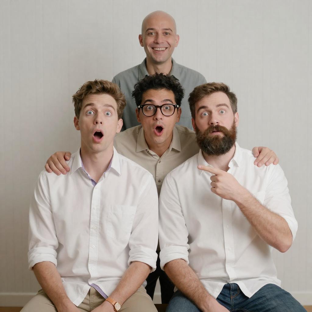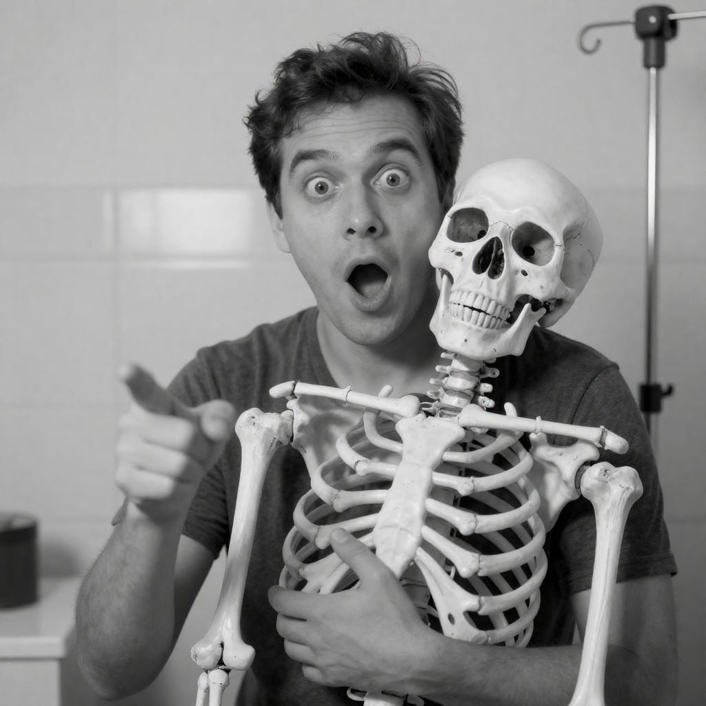 Black-and-white portrait of a man with short dark hair and open mouth in a surprised expression, holding a full skeleton model against his chest. The man's right hand points outward, while the skeleton's skull rests on his right shoulder. Background features a tiled wall and an IV pole, suggesting a medical or educational setting.