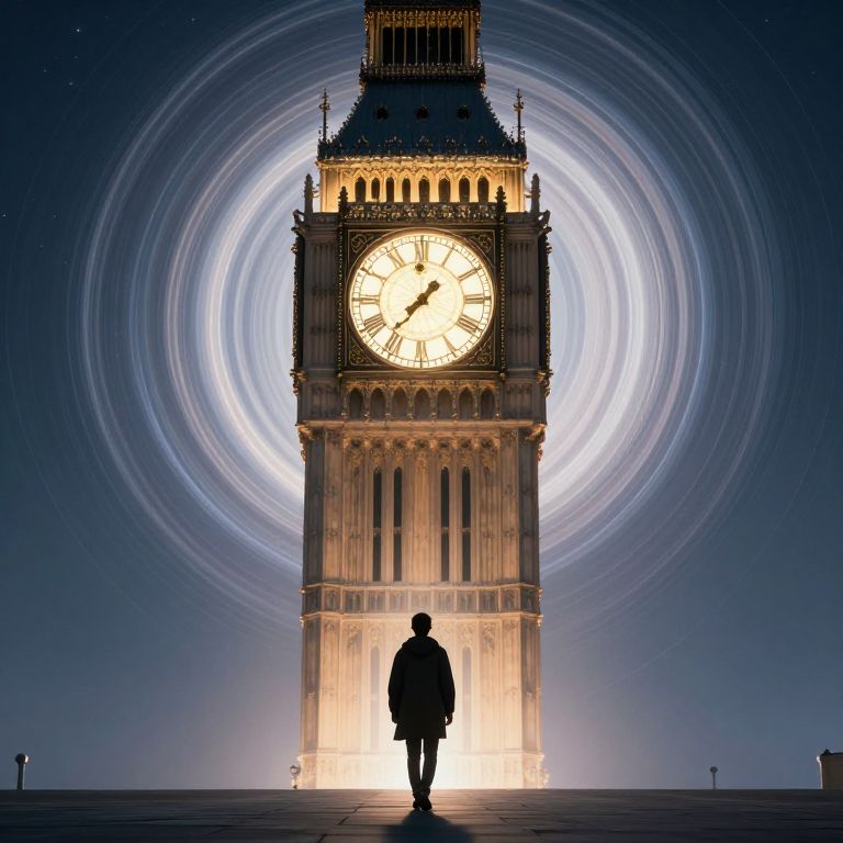 Photograph of London's illuminated Big Ben clock tower at dusk, surrounded by vibrant neon-lit skyscrapers in a bustling cityscape.