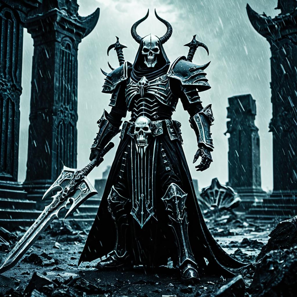 Nightmarish depiction of a Necron Overlord, with ghostly pale plating, wielding a warscythe, in a cavernous chamber.