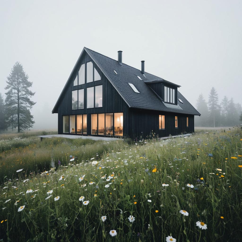 Scandinavian minimalist house, wooden façade, large windows, wildflower meadow, clean design, muted color palette, by Simen Johan, architectural photography, 4K resolution, misty morning light