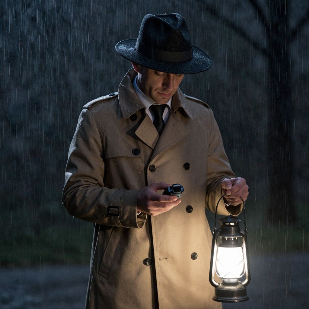 A man in a trench coat and fedora stands in the rain, holding a device, with a lantern illuminating the scene.