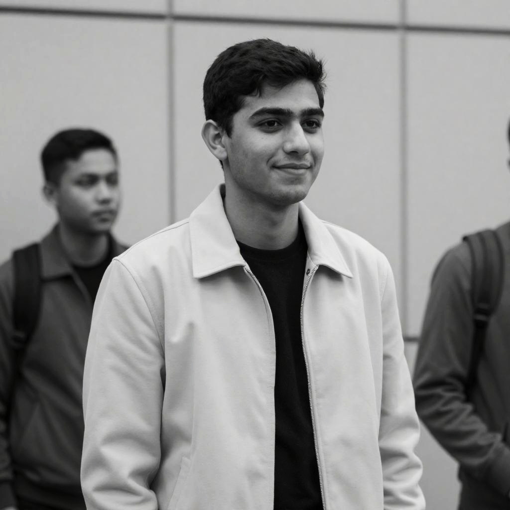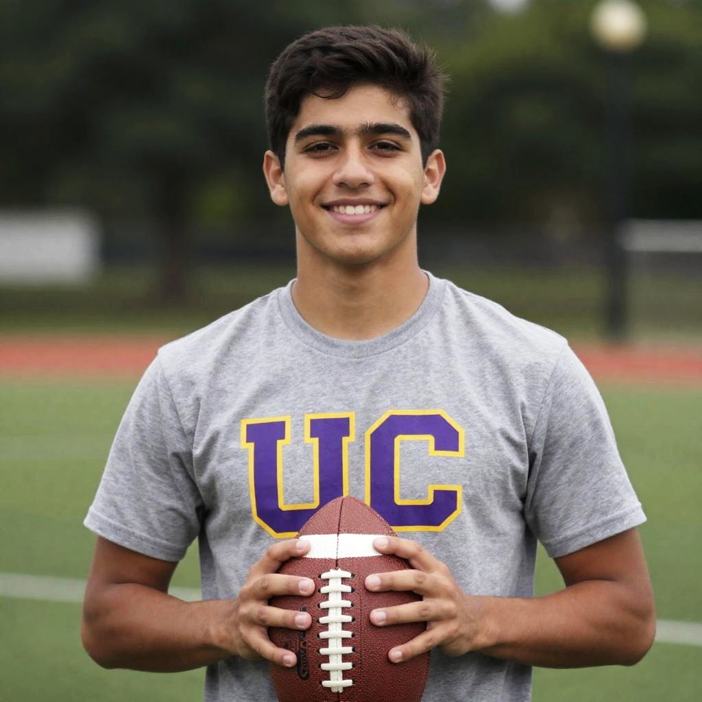 Photograph of a young man with short dark hair, smiling, holding a brown football with both hands. He wears a gray T-shirt with a purple and yellow "UC" . Background: green grass, trees, and a blurry lamp post.