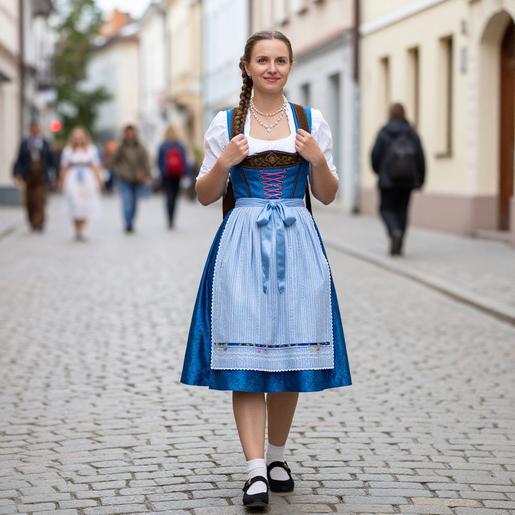 Carry bavarian costume, woman in a blue dress standing on a cobblestone street