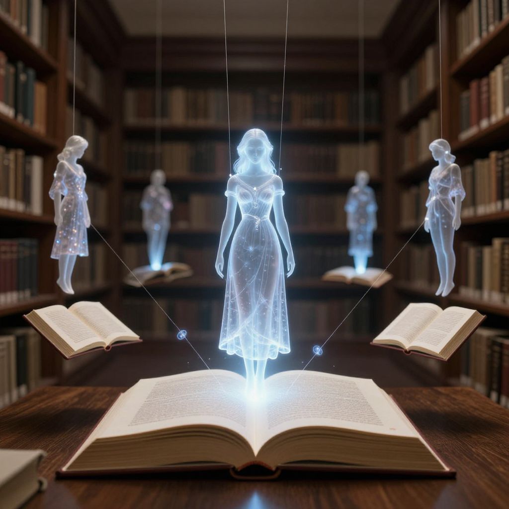 Suspended ethereal figures float above open books in a dimly lit library, each glowing hologram connected by delicate threads to a central, translucent woman standing atop an illuminated tome, surrounded by shelves of knowledge.