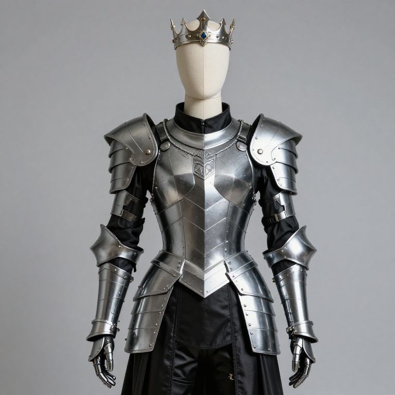 Mannequin wearing a black and silver armor with a crown on his head.