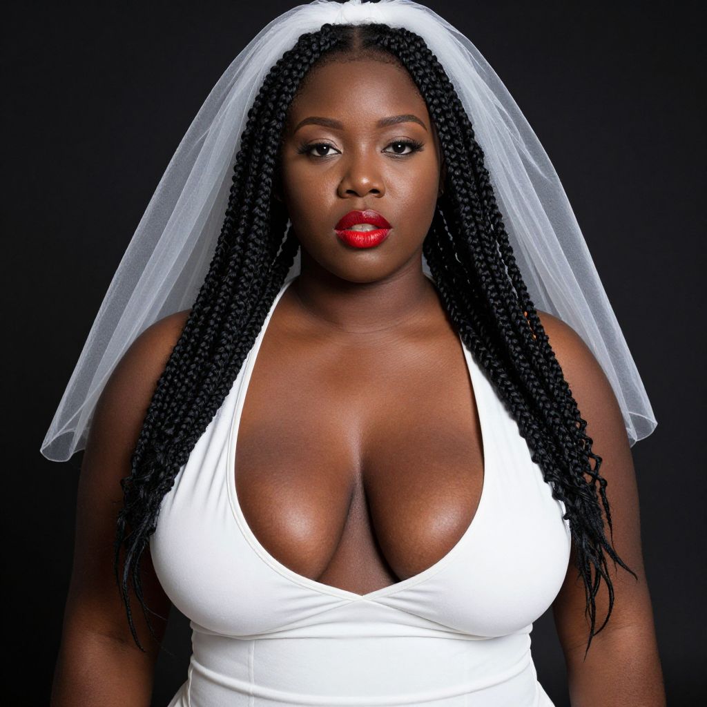 Photograph of a curvy Black woman with dark brown skin and long, twisted braids. She's wearing a white, low-cut, tight-fitting dress that accentuates her large breasts, and a sheer white veil on her head. Her red lipstick stands out against the dark background. She has a confident, slightly sultry expression. The image is sharply lit, highlighting her smooth skin and the texture of her hair.