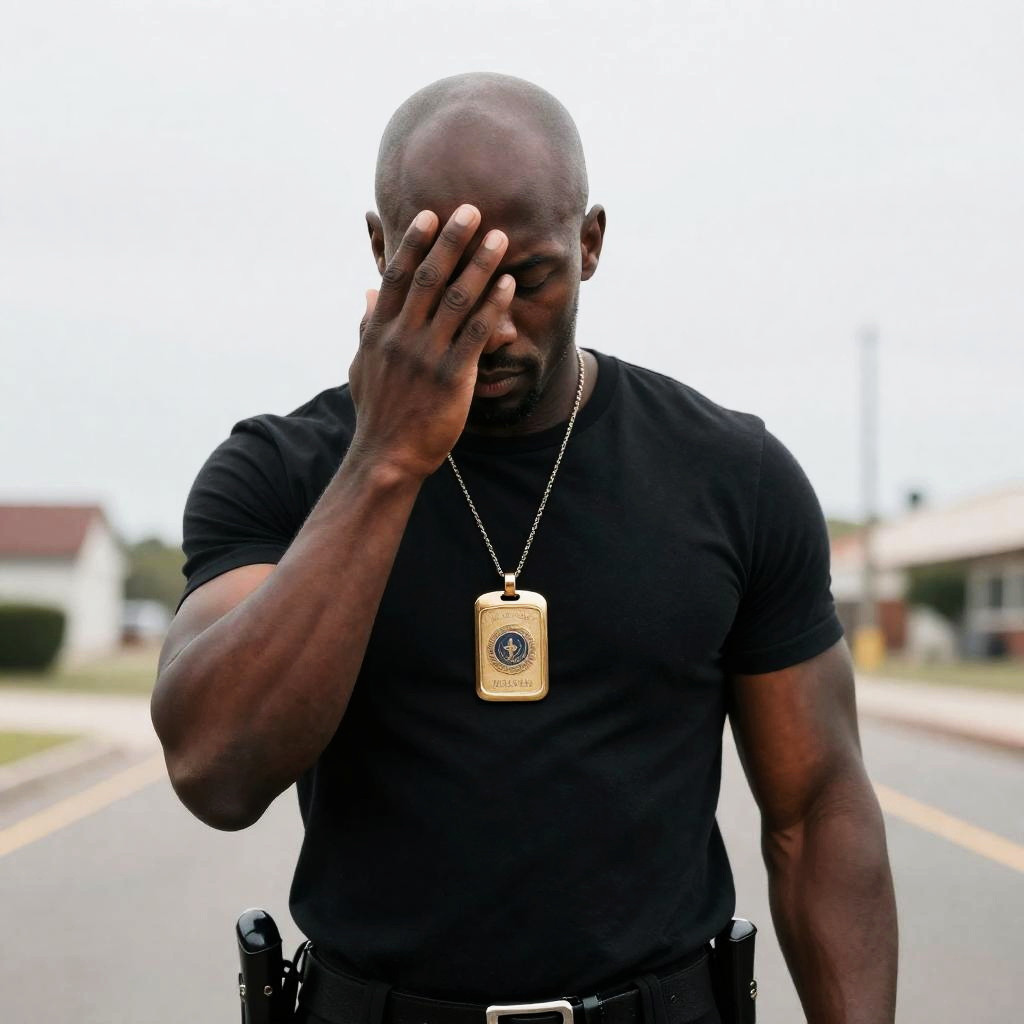Muscular black man with bald head, wearing a black t-shirt and police badge necklace, leans forward, covering his face with his right hand. Outdoor setting with road and distant buildings in the background. Overcast sky. Intense expression.