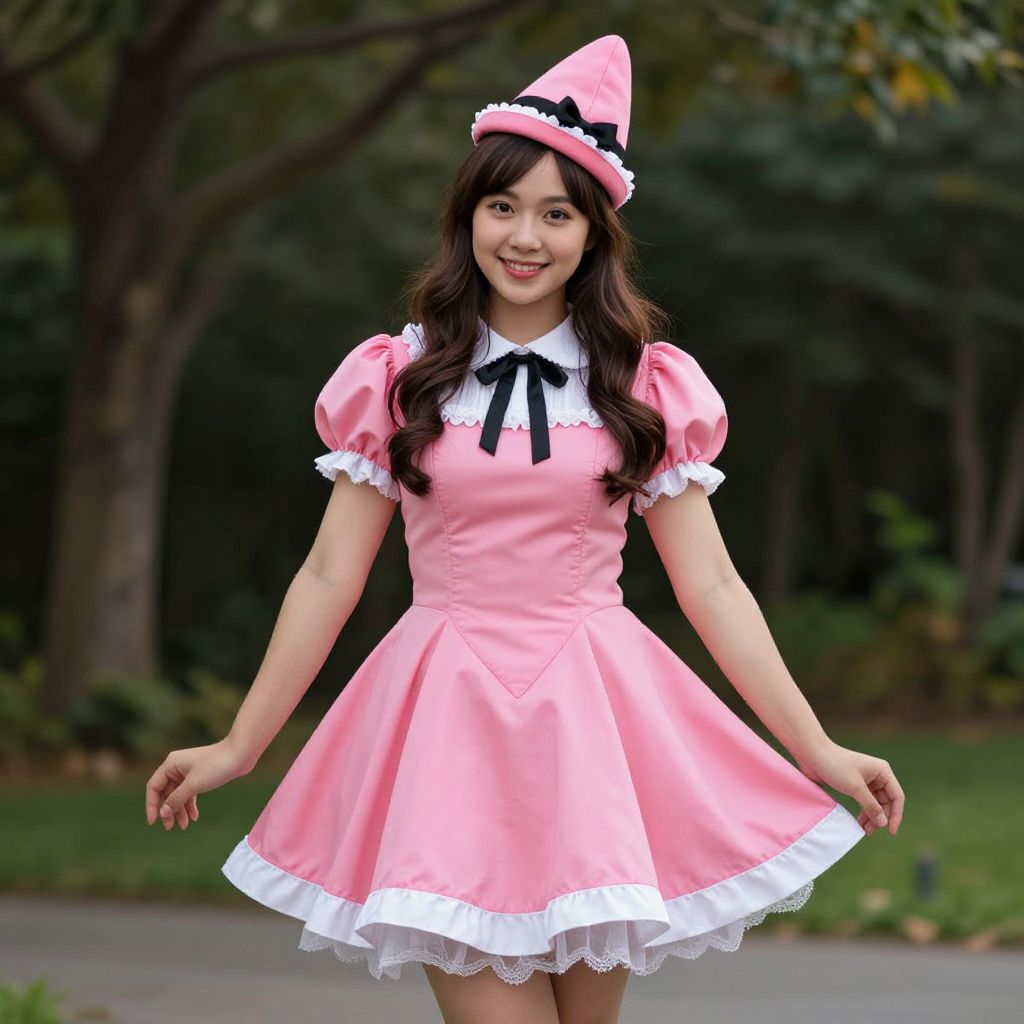 Photograph of an Asian woman with long, wavy dark brown hair, wearing a pink, short-sleeved, flared dress with white lace trim and a black bow at the collar. She also has a pink, pointed hat with a black bow. She stands outdoors on a paved path with a blurred green forest background. She smiles warmly, holding the sides of her dress, which flares out. Her dress has a fitted bodice and a slightly puffy skirt. The overall style is cute and playful, reminiscent of a cosplay or costume. The lighting is natural, enhancing the soft pink of the dress.