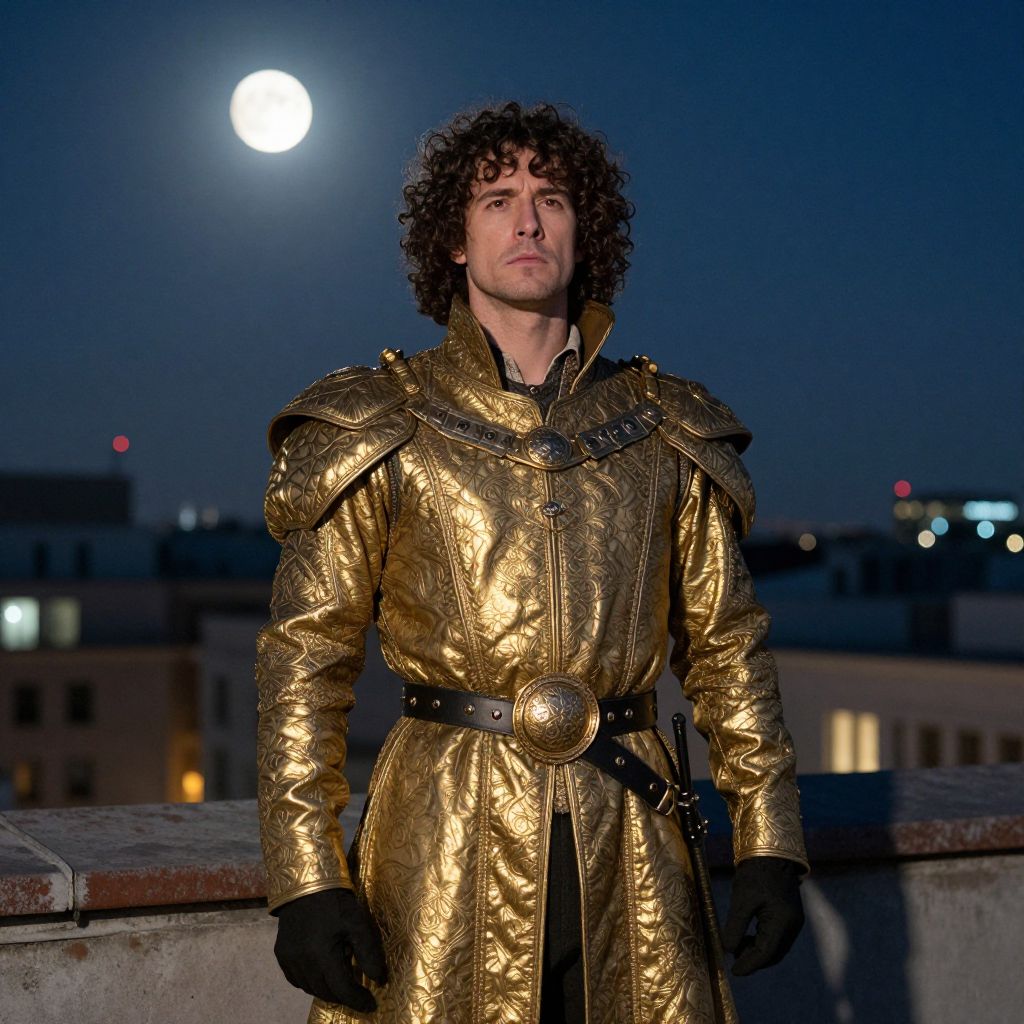 Photograph of a curly-haired man with a serious expression, standing on a rooftop at night. He's wearing an ornate, gold, medieval-style coat with intricate patterns and shoulder armor, belted with a large, circular buckle. His black gloves contrast with the gold. The full moon shines brightly in the dark blue sky, with city lights and buildings blurred in the background.