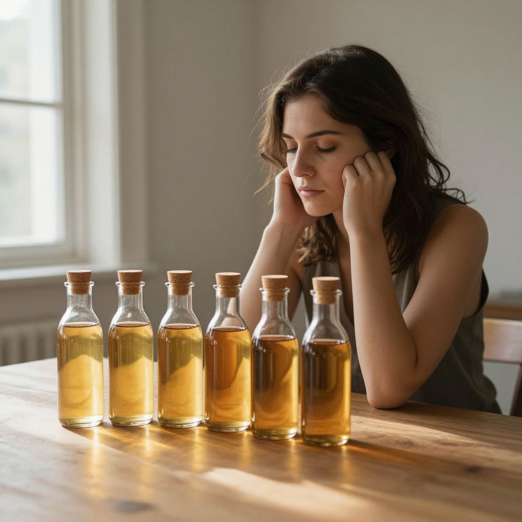 Photograph of a young woman with wavy dark brown hair, light skin, and a slim build, sitting at a wooden table in a sunlit room. She is wearing a sleeveless black top and rests her head on her hands with a contemplative expression. In front of her, there are five clear glass bottles filled with amber-colored liquid, each with a cork stopper. The background features a blurred window with natural light streaming in, creating a soft, warm ambiance. The woman's relaxed posture and the calm setting suggest a moment of quiet reflection.