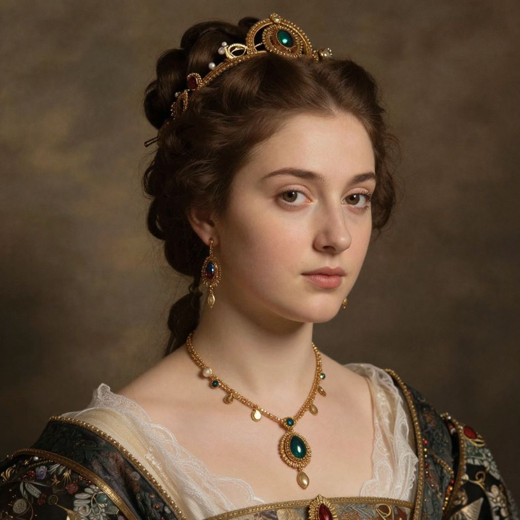 Photographic-style portrait of a young, fair-skinned woman with dark brown hair styled in an intricate updo, adorned with a gold and turquoise tiara. She wears a dark, patterned gown with gold trim and a white lace collar. Her jewelry includes matching gold and turquoise earrings and a necklace with a large emerald pendant. Her expression is calm and composed, looking slightly to the right. The background is a muted, textured brown, highlighting the subject. The lighting is soft, emphasizing her delicate features and the elegance of her attire.
