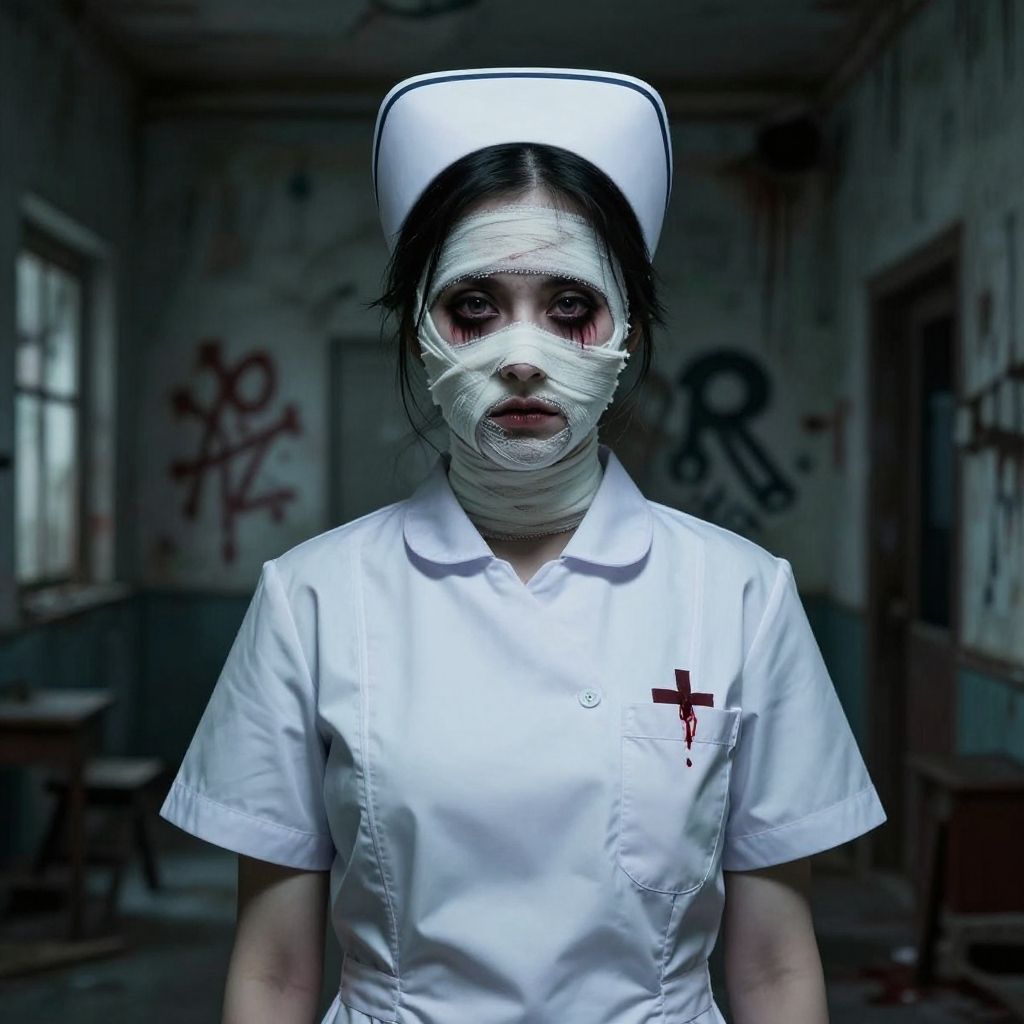 Score_10, score_9, score_8_up, score_7_up, nurse, haunted, sunken eyes, bandaged, creepy, eerie, asylum background, creepy graffiti on walls, abandoned, (blood: 1.1), scary, cinematic lighting, (extremely detailed: 1.3), 8k, hd