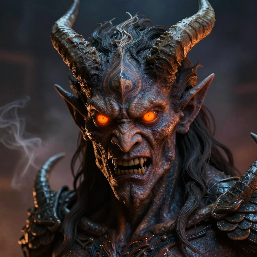 Close-up of a humanoid demon with intricate facial tattoos and long twisted horns, piercing glowing orange eyes, snarling expression, textured skin with scales and shadows, ambient dark background with ethereal smoke, highly detailed portrait style.