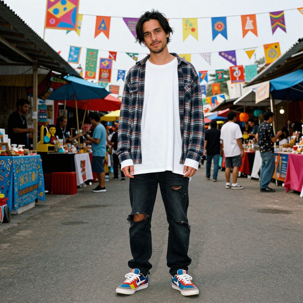 A man, plaid flannel shirt, distressed black jeans, oversized white long-sleeve tee, colorful skate shoes, grunge vibe, vibrant street stalls, colorful banners fluttering, lively music echoing, ib technicolor film stock, relaxed smile, carefree expression. Man has masculine face and piercing eyes