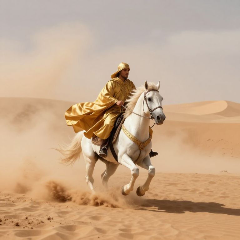 Rider galloping through a swirling desert sandstorm, cloaked in golden hues, atop a white horse adorned with ornate tack, as billowing clouds of dust frame the scene in dramatic contrast against the arid landscape.