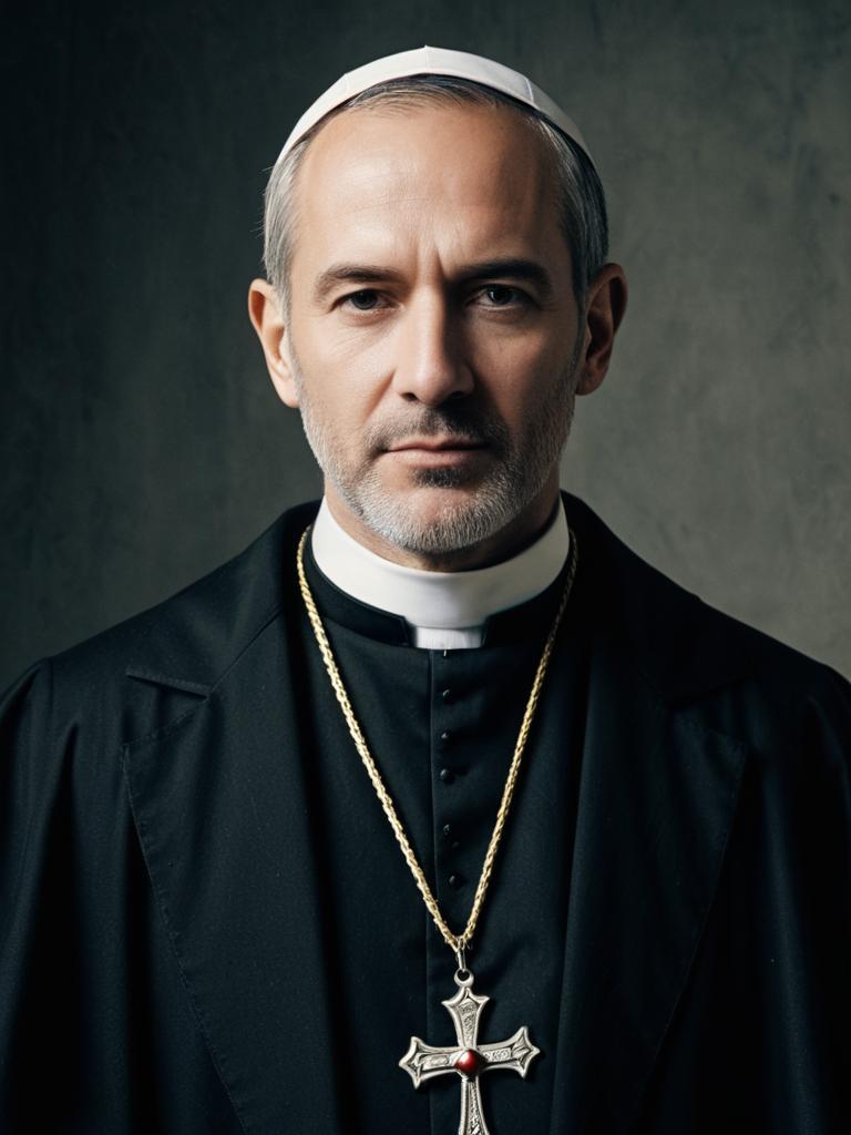 Man in Catholic Priest costume, photorealistic studio cosplay portrait, sharp detail