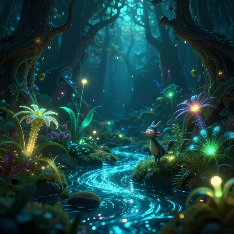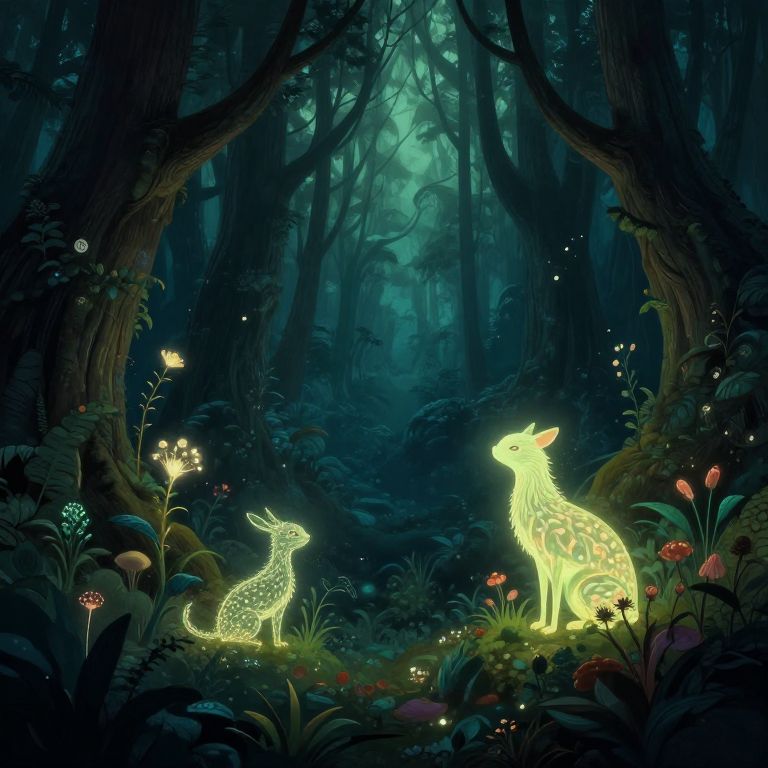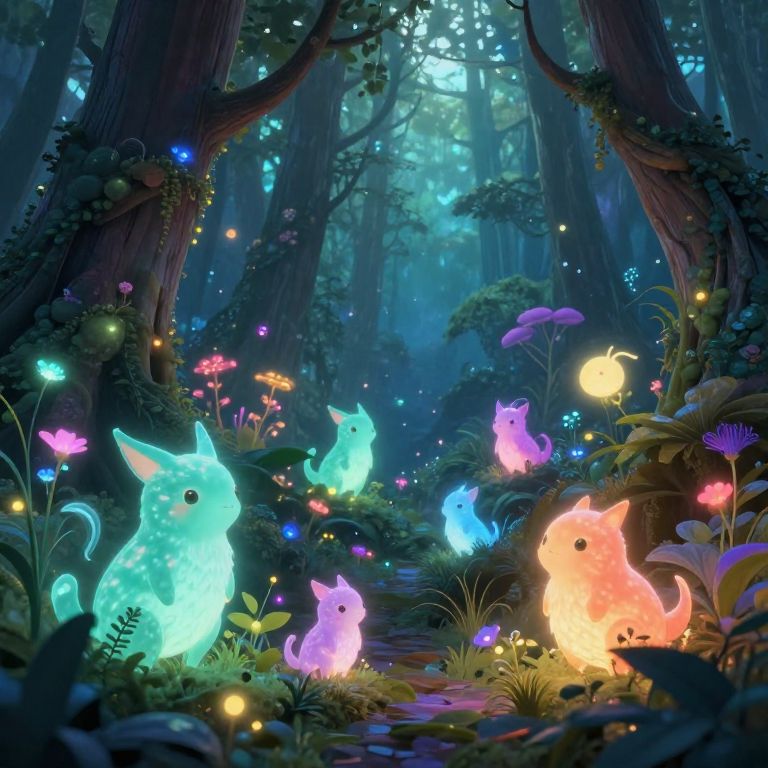 Wгјrze, enchanted forest with bioluminescent plants and magical creatures, soft glowing lights illuminating the dark woods, whimsical and ethereal mood, highly detailed fantasy illustration
