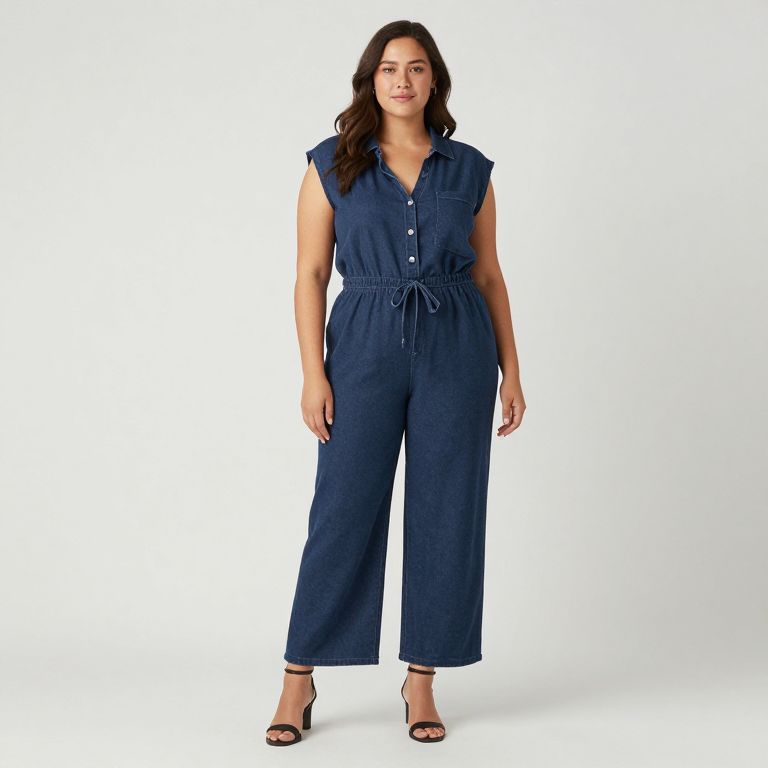 Photograph of a young woman with medium-length, wavy dark brown hair standing against a plain white background. She is wearing a sleeveless, navy blue, button-up jumpsuit with a cinched waist and tie belt, and black open-toe heels. Her expression is neutral, and she stands with her arms relaxed by her sides. The jumpsuit has a slightly loose fit, and the fabric appears to be lightweight and slightly textured. The lighting is even, highlighting the rich color of the jumpsuit and her natural skin tone.