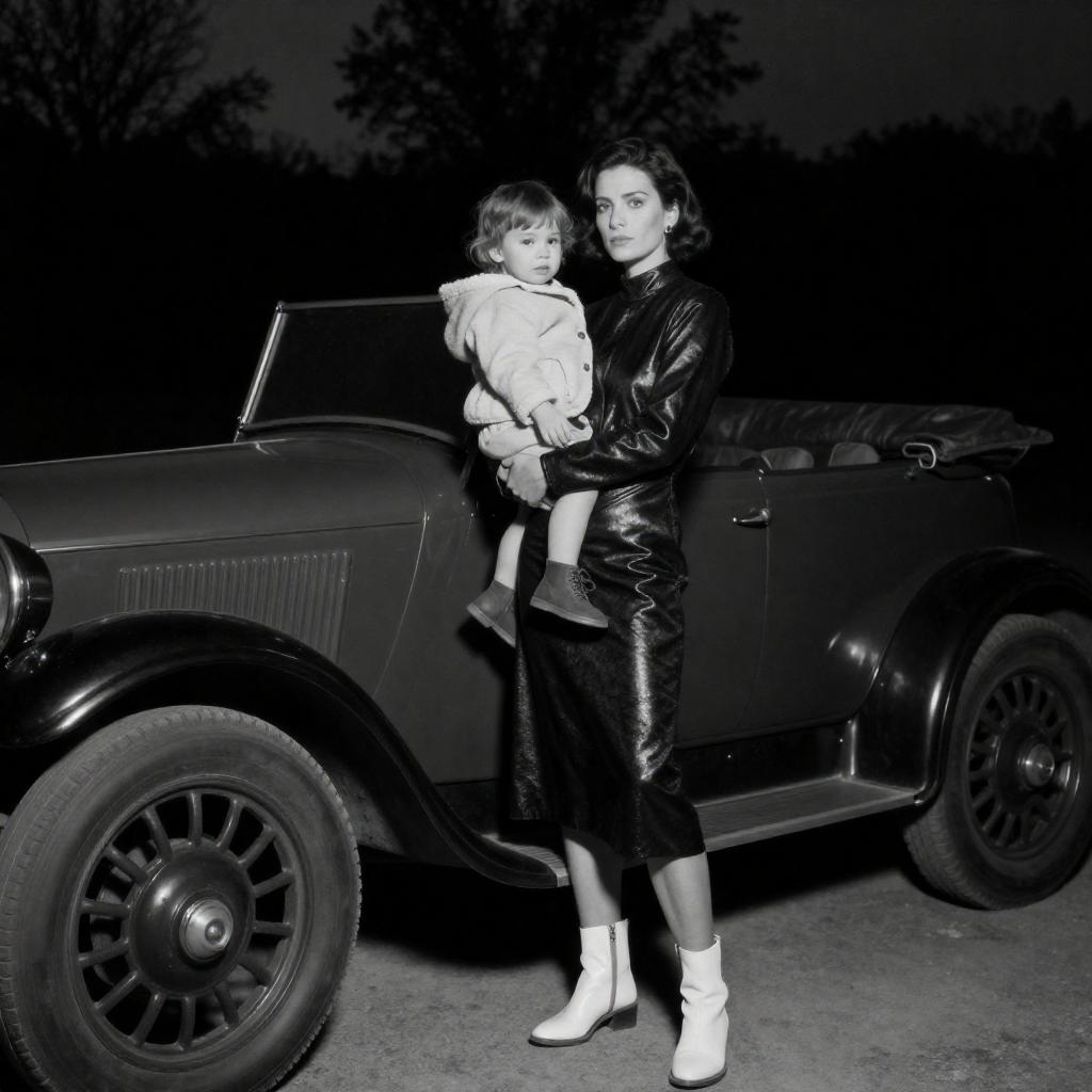Black-and-white photograph of a woman in a shiny, black, long-sleeve dress and white boots, holding a small child in a light-colored coat. They stand beside a vintage, rounded, black car with large wheels. The background is dark, with faint tree silhouettes. The woman has short, dark hair and a serious expression.