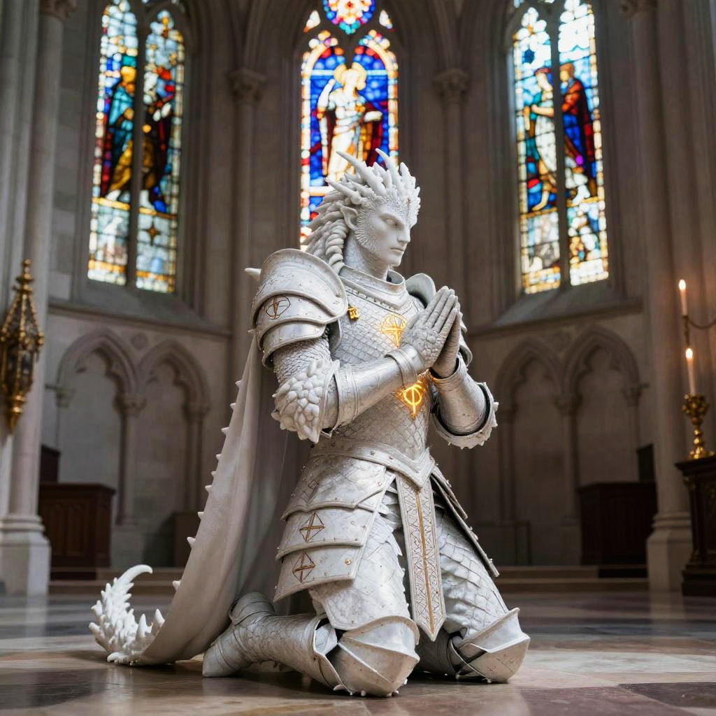 White dragonborn paladin kneeling in prayer inside a grand cathedral, stained glass windows casting colorful light on his scaled armor, sacred symbols glowing, serene and powerful atmosphere