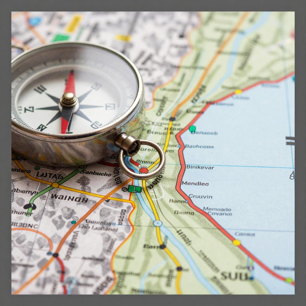 A close-up photograph of a silver compass with a red needle pointing right, resting on a colorful road map. The map features detailed roadways, town names, and colorful regions. The compass's metallic texture contrasts with the map's vibrant colors and fine lines. The image has a gray border, adding a framed effect. The compass is positioned in the upper left corner, with the map covering the lower right.
