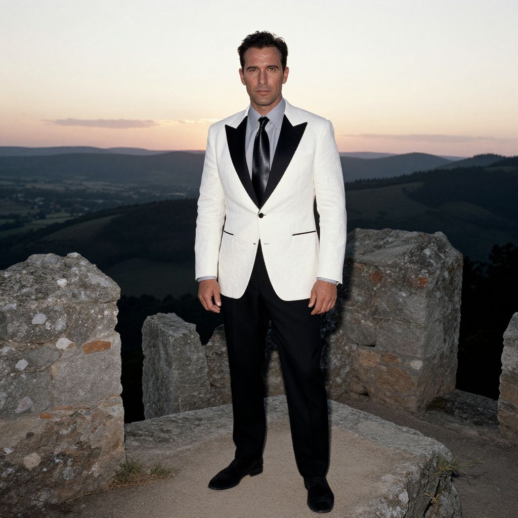 A man, linen white dinner jacket, black notch lapels, light gray dress shirt, black leather tie, tailored black trousers, suede black derby shoes, crumbling castle towers, sweeping valley views, sunset glow, Ilford film stock, confident expression Man has masculine face and piercing eyes