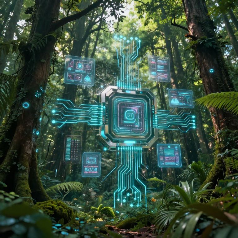 Digital CGI image of glowing, neon-blue, futuristic circuit board with holographic screens floating in a dense, lush forest.