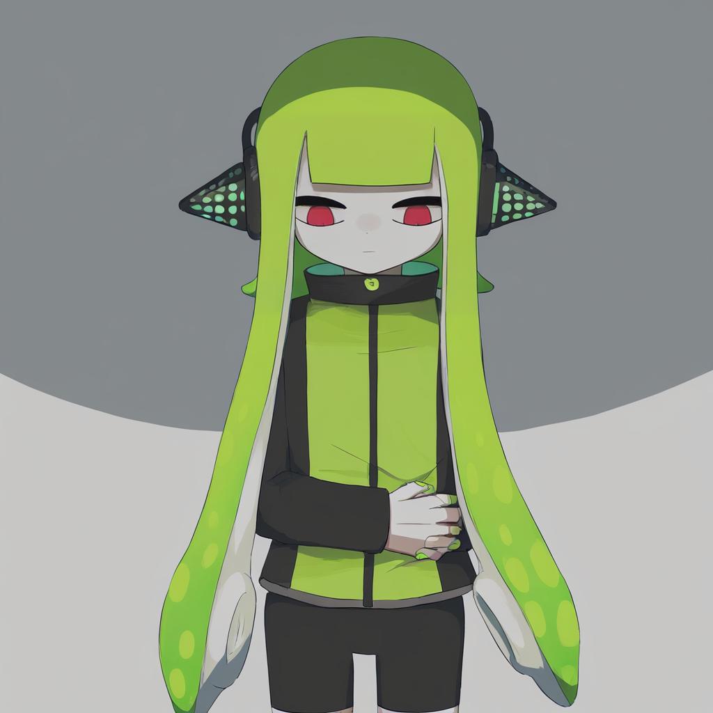 Agent 3 (splatoon), splatoon (series), 1girl, pointy ears, tentacle hair, long hair, green hair, blunt bangs, bike shorts, long sleeves, squidbeak splatoon, squidbeak splatoon, headgear, by artist kirigakure (kirigakure tantei jimusho), leet